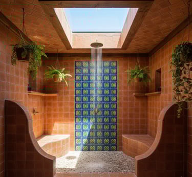 Design your shower to evoke the open, airy feeling of a Spanish courtyard. This often means a spacious, walk-in shower with minimal glass or even an open-air "wet room" design. Line the shower walls with terracotta or vibrant mosaic tiles to continue the theme. Adding a built-in bench or a skylight above can further enhance the serene, oasis-like atmosphere.