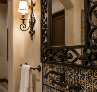 Wrought iron hardware and fixtures are a simple way to add classic Spanish character. Look for mirror frames, wall sconces, towel racks, or cabinet pulls made from this durable material. The dark, often ornate, metalwork provides a striking contrast against light plaster walls or colorful tiles. These accents add a layer of elegant, old-world craftsmanship without dominating the design.