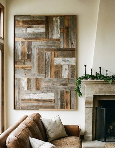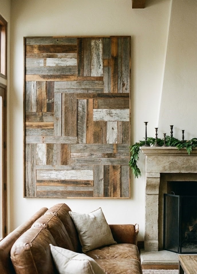 Rustic chic remains a beloved style because of its warmth. Wall art made from reclaimed wood—whether it is a mosaic of different timber stains or a carved wooden relief—brings texture and history to the space. This is a perfect match for farmhouse or industrial-style homes.