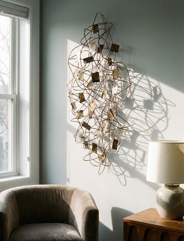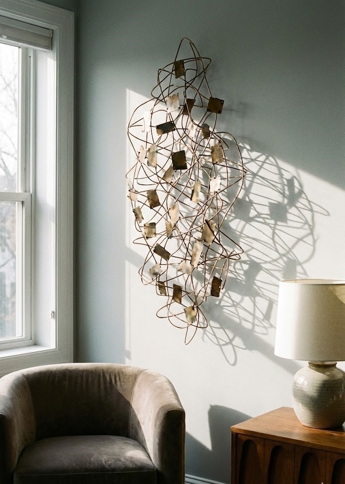 Break the monotony of flat frames by introducing three-dimensional art. Metal sculptures, ceramic wall flowers, or wire art cast interesting shadows that change throughout the day as the light moves. This adds a dynamic layer to your decor that flat paintings cannot replicate.