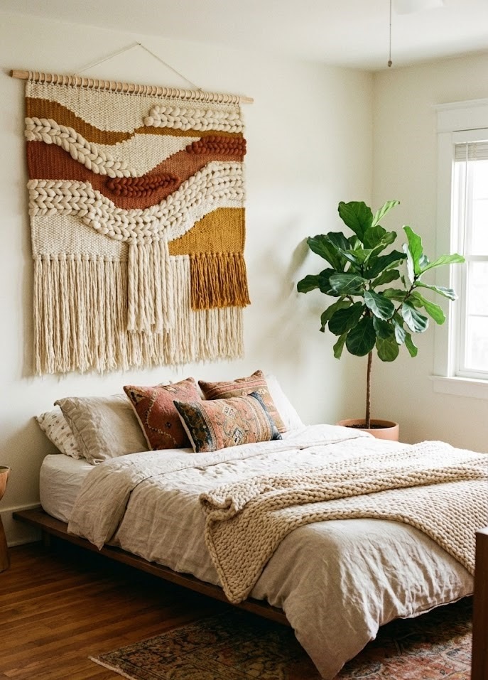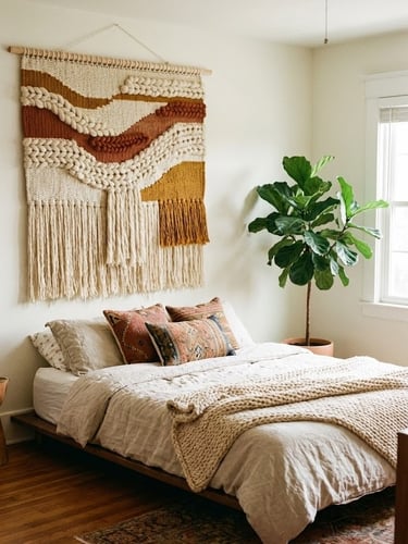 Hard surfaces like wood floors and drywall can sometimes make a room feel cold or echoey. Combat this with textured wall hangings. Macramé pieces, woven tapestries, or fiber art add physical warmth and softness. These are ideal for bohemian interiors or bedrooms where you want to increase the "cozy" factor.