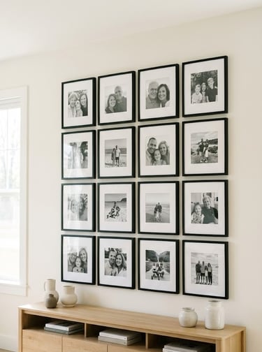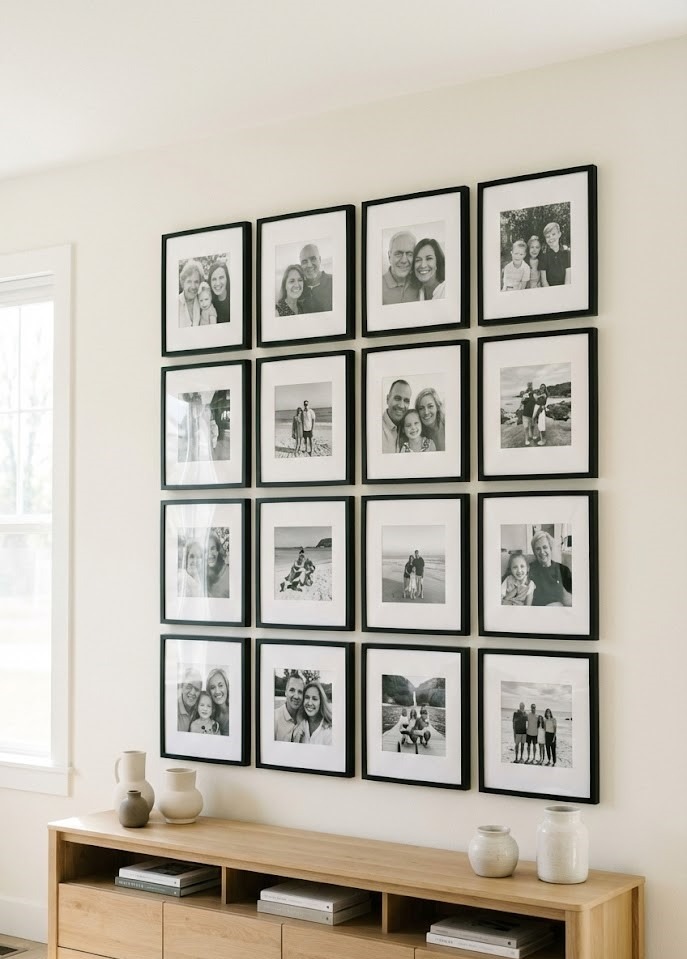 Move beyond the standard mantelpiece frames and create a dedicated gallery wall for family memories. To keep the look cohesive and designer-friendly, use matching frames (all black, white, or wood) and consider converting your photos to black and white. Arranging them in a symmetrical grid offers a clean, modern look, while a salon-style arrangement feels more organic and homey.