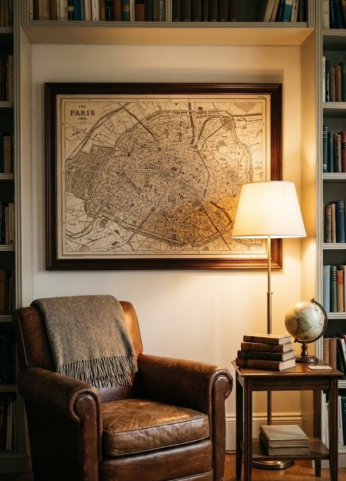There is a romantic quality to old cartography. Framed vintage maps of your hometown, favorite vacation spots, or dream destinations add a sense of wanderlust and intellect to a study or living area. The sepia tones of antique maps also coordinate easily with neutral color palettes.