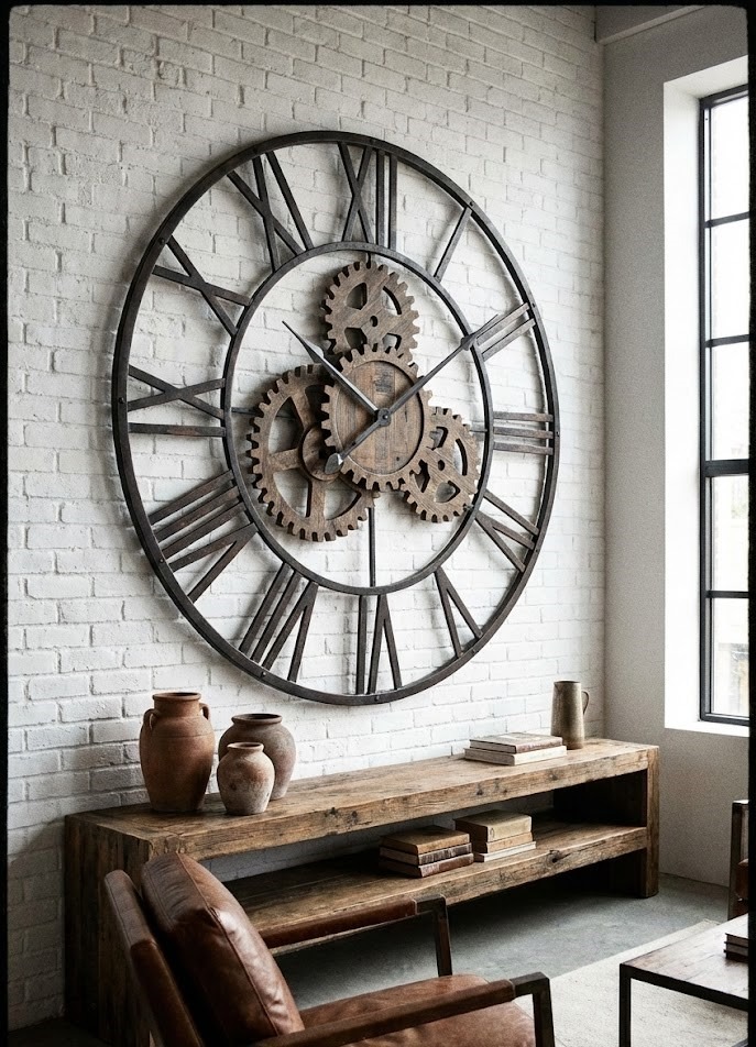 A clock is a necessity, but an oversized wall clock is a statement. Large open-face clocks made of iron or wood act as functional industrial art. They fill a large wall effectively without feeling too "heavy," as the wall color shows through the open design.