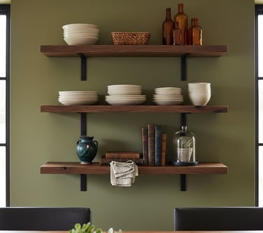 Incorporate open shelving to combine practical storage with decorative flair. Use wooden or metal shelves to display curated items like hand-thrown pottery, antique glassware, or small woven baskets. Depending on your style, you can paint the shelves a muted, earthy color or leave the wood in its natural state. This approach allows you to showcase your favorite rustic pieces while also keeping everyday items within easy reach. Just be sure to arrange the items neatly to prevent a cluttered appearance.