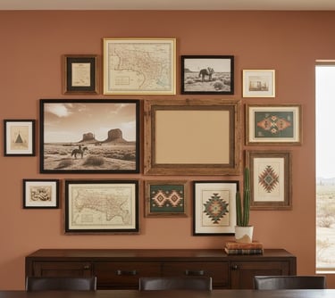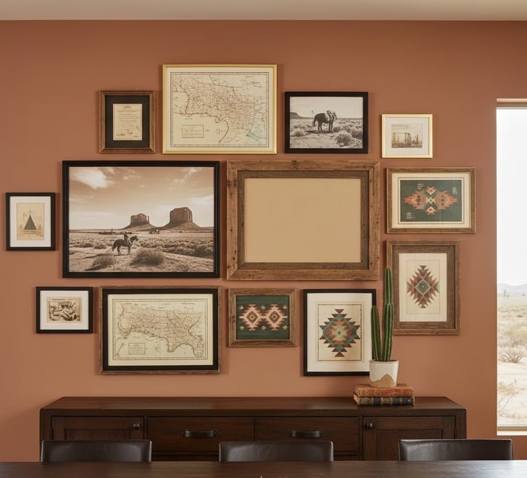Choose rustic wall art to enhance the room's character. Framed vintage maps, sepia-toned photographs of western landscapes, or subtle Native American-inspired geometric prints are all excellent choices. You can arrange several smaller pieces in a gallery-style layout for a high-impact effect. Be sure to select frames made of wood or dark metal to complement the decor. For a simpler approach, one oversized piece of art can effectively anchor the space.