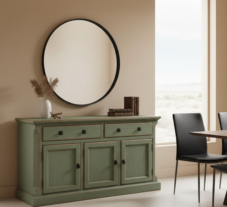 Furniture with a distressed finish, such as a sideboard or cabinet, adds a sense of history and character. This 'lived-in' look is central to rustic charm. You can find pre-distressed pieces or create the effect yourself using techniques like chalk paint and light sanding on the edges. To keep the look intentional and not overwhelming, apply this finish to just one or two key pieces. Contrast these rustic items with sleeker, modern elements elsewhere in the room for a balanced design.