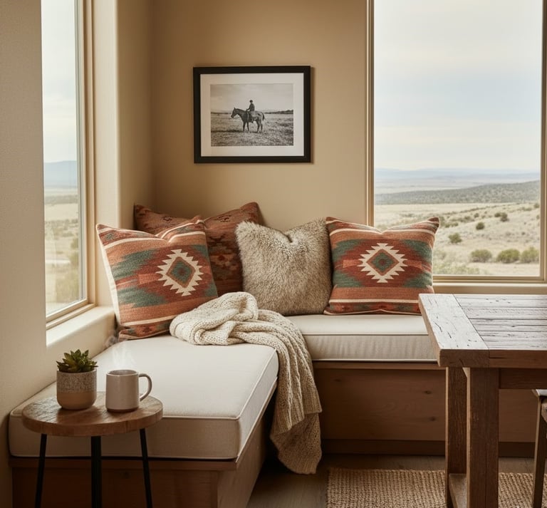 If your dining room has the space, create a small, cozy nook. This could be a window seat or a cushioned bench built into a corner. Make this spot extra inviting by adding throw pillows featuring southwestern patterns or rich, soft textures. This supplementary seating area is perfect for casual moments, like enjoying a morning coffee or chatting with guests away from the main table, and it enhances the room's overall welcoming feel.
