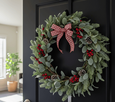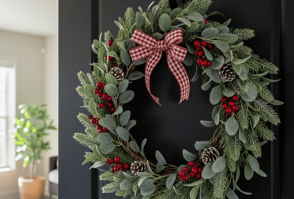 A wreath on your door is a classic holiday welcome. For an apartment, a slim-profile wreath is often best so it doesn't get in the way.