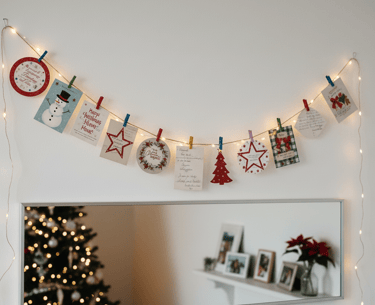 Simply cut the cards into festive shapes—like circles, triangles, or stars—and attach them to a long piece of twine using mini clothespins.