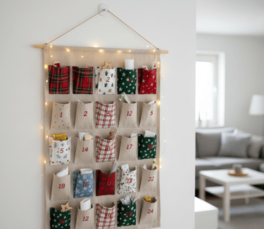 To make it, attach small felt or fabric pockets to a larger backing piece of fabric, numbering each one from 1 to 24. You can use hot glue for a no-sew version. Hang the entire calendar from a small wooden dowel.