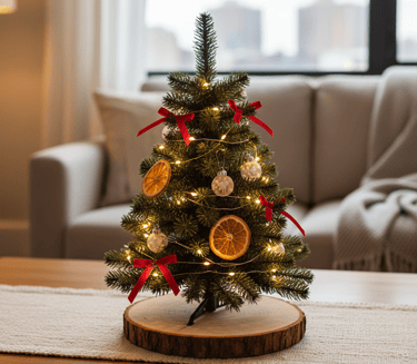 Select a tree around two or three feet tall. For a hazard-free, cord-free glow, wrap it in a strand of micro-LED battery-operated lights. Decorate with lightweight items like tiny baubles, ribbons, or aromatic dried orange slices. Placing it on a rustic wood slice can add extra charm.