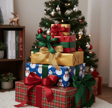 Wrap them in beautiful, coordinating wrapping paper and tie them up with elaborate ribbons and bows. You can then stack them on a shelf, in a corner, or under your mini tree as decor.