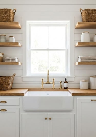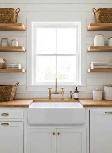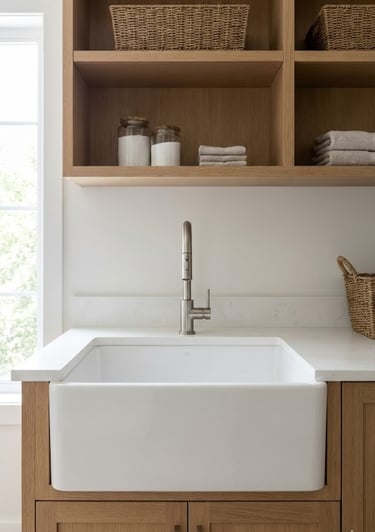 Nothing says "laundry room luxury" quite like a deep farmhouse sink. Traditionally made of fireclay or porcelain, the exposed front "apron" breaks up the cabinetry lines and adds a touch of timeless country charm. Beyond aesthetics, these sinks are incredibly practical; their deep basins minimize splashing and provide ample room for soaking bulky items like bedding or curtains.