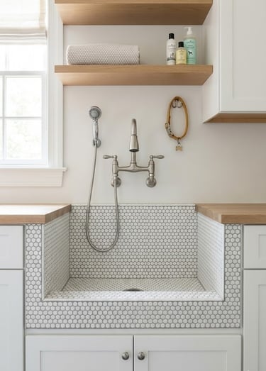 If you have furry friends, this trend is a game-changer. Elevate the laundry sink into a dedicated pet washing station. These are typically wider, lower-profile tiled basins equipped with a hand-held sprayer. By incorporating this into your laundry room, you keep the muddy paw prints out of your main bathtub and make grooming effortless.