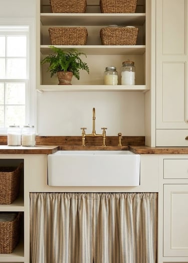 Soften the look of your laundry area by replacing the cabinet doors under the sink with a fabric skirt. This is a classic English cottage design element that adds texture and warmth. It is also an affordable DIY update that hides plumbing and cleaning supplies while allowing for easy access.