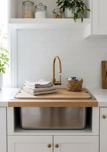 If counter space is at a premium, look for a drop-in sink that comes with a custom-fitted cutting board or cover. When the sink is not in use, the cover provides a flat surface for folding clothes or sorting baskets. This smart design hack essentially doubles the utility of your workspace.