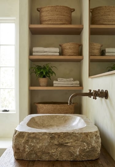 For an organic, spa-like feel, install a sink carved from a solid block of granite, marble, or river stone. The rough, textured exterior contrasts beautifully with a polished interior. This choice brings the outdoors in and pairs exceptionally well with wood shelving and woven storage baskets, creating a serene environment for your daily tasks.