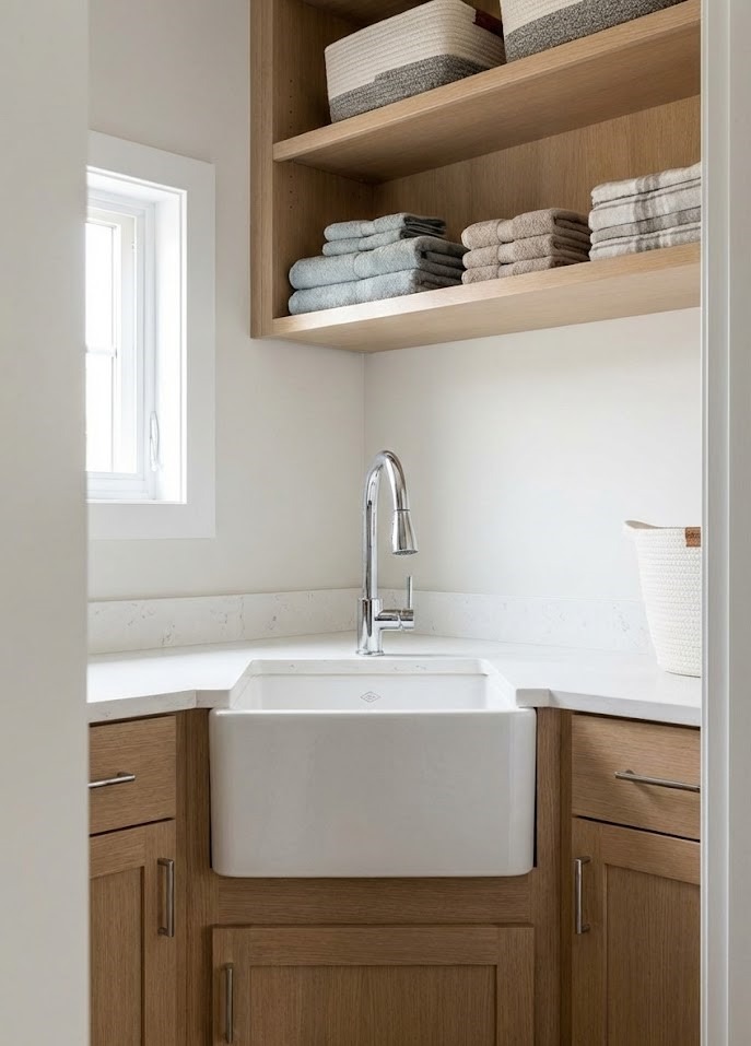 In L-shaped or small laundry rooms, the corner is often dead space. A corner sink utilizes this awkward area efficiently, freeing up the longer straight runs of counter space for folding and ironing. Deep corner basins allow you to stand comfortably while maximizing the room's footprint.