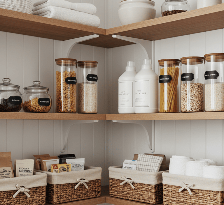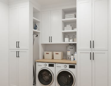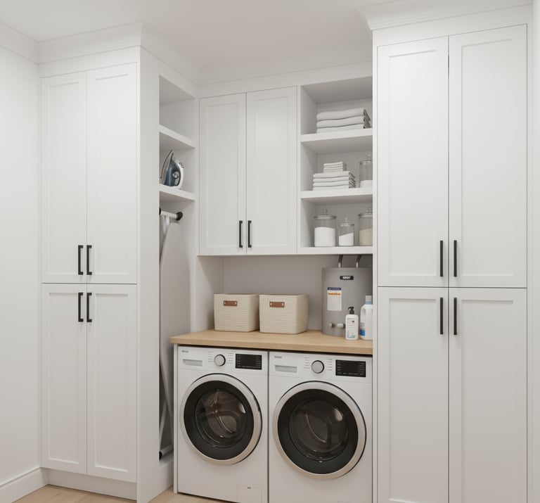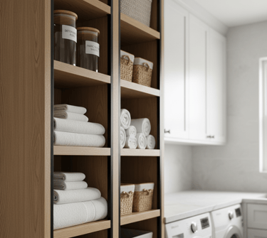 In smaller homes, the laundry room often doubles as a pantry. Use sturdy, adjustable shelving that can accommodate both tall detergent bottles and bulk food items.