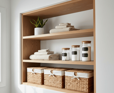 Upper cabinets are ideal for hiding less attractive items—think bleach, cleaning supplies, or mismatched towels. This gives the room a clean, streamlined, and polished appearance.