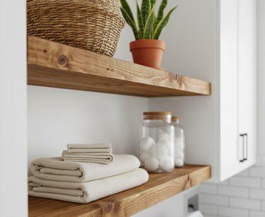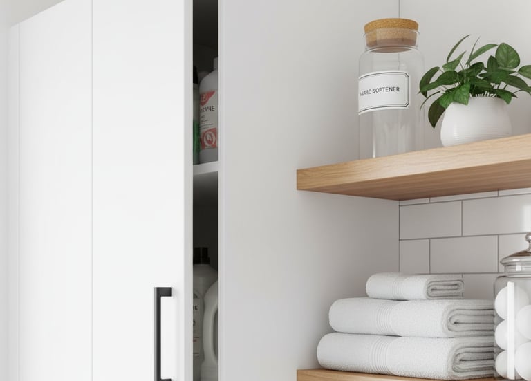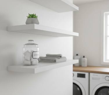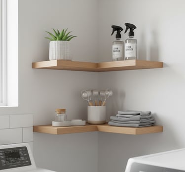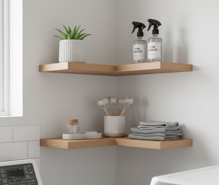Corners are often wasted space. Install simple L-shaped or triangular corner shelves to hold smaller items like stain removers, lint rollers, or a small plant.