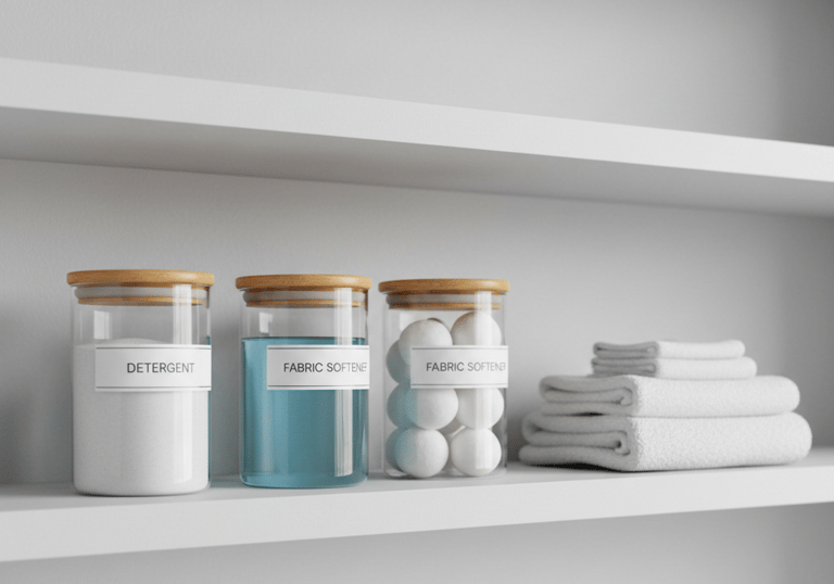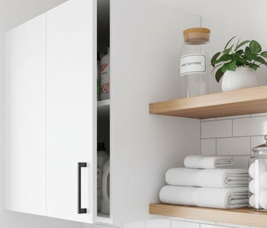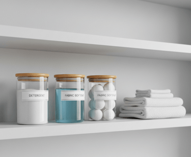 This is perfect for keeping your most-used items, like detergent and dryer balls, in plain sight. It makes the room feel larger and more open, especially if you use matching containers.