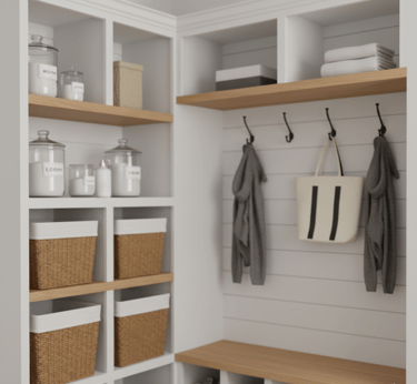 If your laundry room is near an entrance, combine its function. Add a shelving unit with hooks for coats, cubbies for shoes, and upper shelves for laundry detergent.