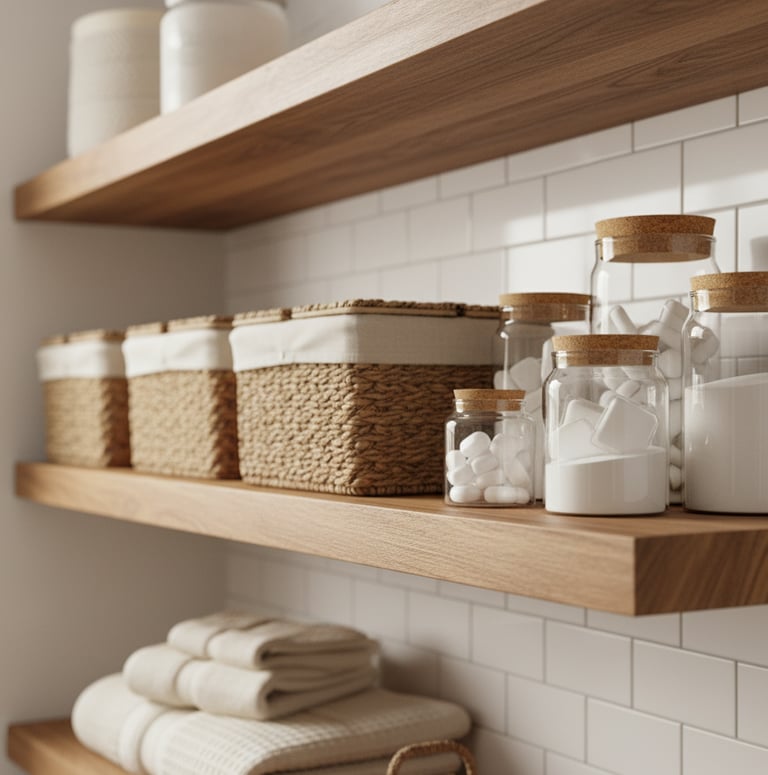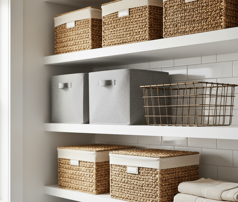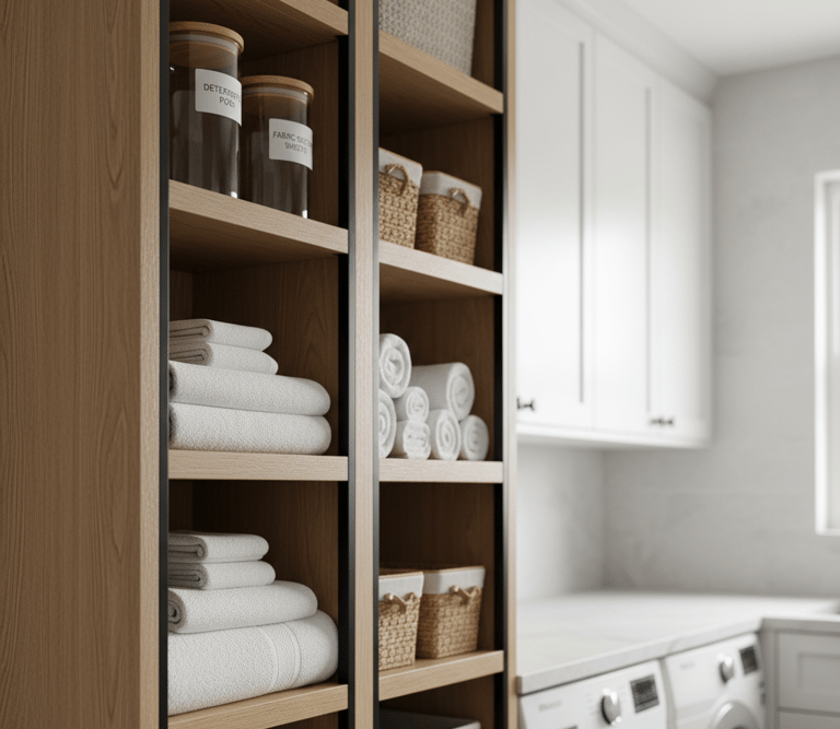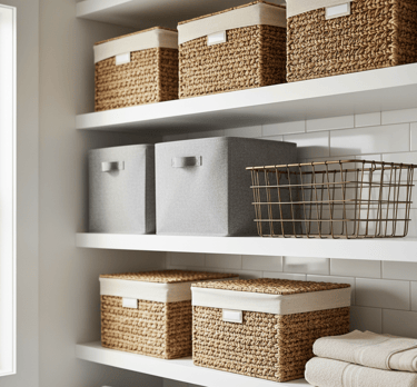 Woven wicker, fabric, or wire baskets are the key to making open shelves look tidy. They hide visually cluttered items (like loose dryer sheets) and add a textural, decorative element.