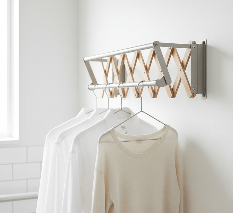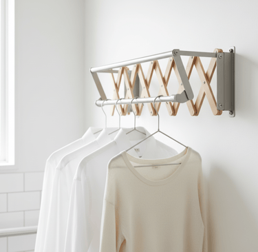 A foldable or retractable drying rack mounted to the wall is essential for air-drying clothes. It saves floor space and can be tucked away when not in use.