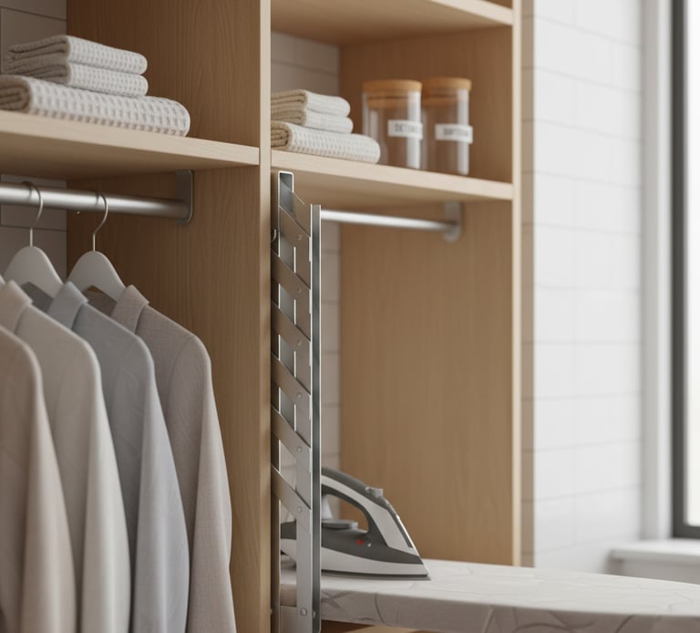 Look for shelving units that do more than one job. A shelf with a built-in hanging rod or a fold-out ironing board is a brilliant space-saver.