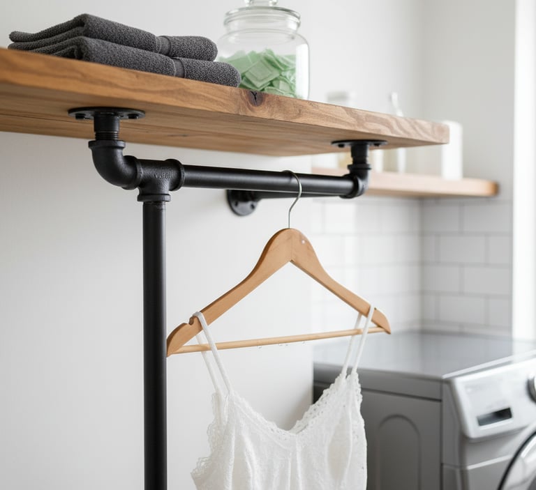 For a popular and sturdy look, combine warm wood planks with black industrial pipes. You can add a lower pipe to serve as a convenient hanging rack for delicates.