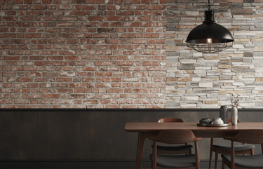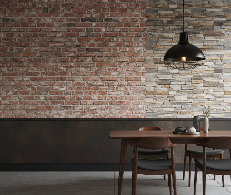 Achieve an industrial or rustic farmhouse look without the need for a mason. High-quality wallpaper can convincingly mimic exposed brick, concrete, or stacked stone. This "faux" material adds rugged texture and an urban, lofty feel to a space, providing a compelling contrast to more refined dining furniture.
