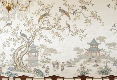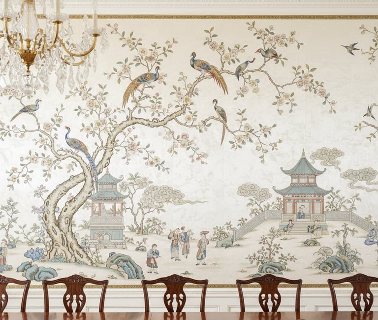 This classic 18th-century European interpretation of Chinese artistry remains a timeless choice for elegant dining rooms. Chinoiserie papers typically feature intricate, hand-painted-style scenes of nature, with birds, delicate branches, and pagodas. They add a sophisticated, artistic, and often serene quality to a room.