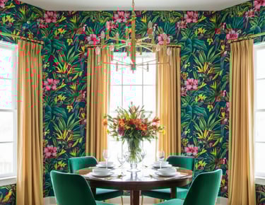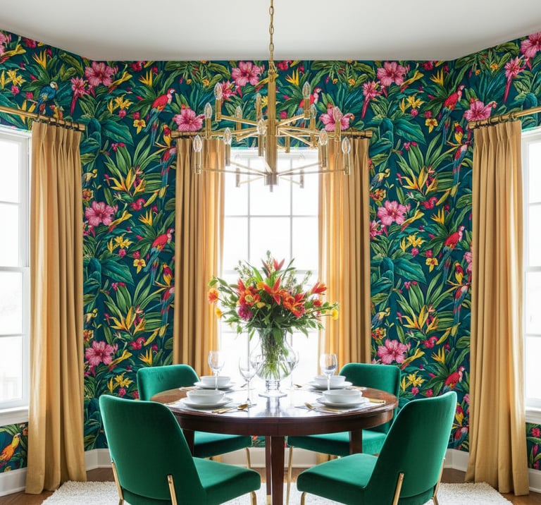 Bring a vacation vibe home with large-scale tropical prints. Featuring lush palm fronds, exotic flowers, and vibrant birds, these designs create a bold, energetic, and fresh atmosphere. This style, often associated with "Hollywood Regency," adds a touch of escapism and drama to the dining experience.