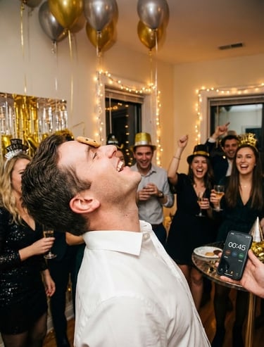 Based on the popular "Minute to Win It" concept, these games use household items for quick, hilarious tasks. Think stacking cups, moving cookies from your forehead to your mouth without hands, or bouncing ping pong balls into champagne flutes.