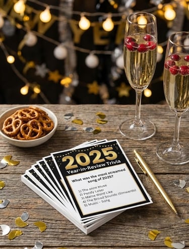 Test your guests' knowledge of the past 12 months. Create questions covering pop culture, news, and viral trends from 2025. It’s a great way to reminisce about the year's biggest moments while sparking friendly competition.