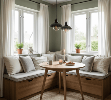 Transform your dining area into a snug corner perfect for everyday meals or quiet mornings. Built-in benches with soft cushions and throw pillows create an inviting spot to relax. Add warm lighting—like pendant lights or candles—and natural touches such as potted plants or woven rugs. Pair a compact wooden table with your seating to keep the area practical yet charming. The result is a warm, comfortable nook that feels both intimate and effortlessly stylish.