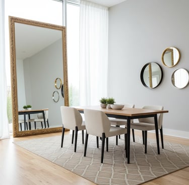 Mirrors are a designer’s secret for making small dining spaces feel larger and brighter. Place a mirror opposite a window or near a light source to reflect light and enhance the room’s ambiance. A large, decorative mirror can serve as a statement piece, while smaller grouped mirrors add texture and style. Just make sure to position them thoughtfully to avoid reflections directly at the dining table, ensuring a comfortable and elegant setting.