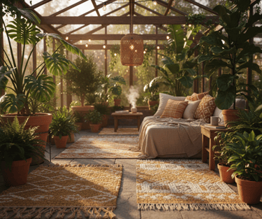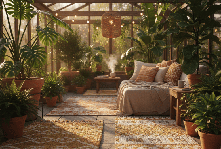 Stone or concrete floors can feel cold and industrial. Layering decorative rugs adds immediate warmth and texture to the greenhouse. Opt for outdoor-rated rugs that can withstand humidity; they define seating areas and make the space cozy enough for barefoot relaxation.