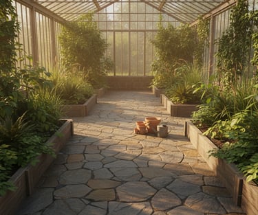 The foundation of your greenhouse sets the tone. Natural stone flooring provides a durable, earth-toned base that complements the greenery perfectly. Unlike concrete, natural stone offers unique textures and color variations that age beautifully over time.