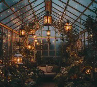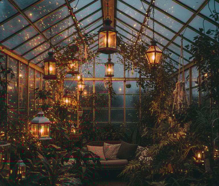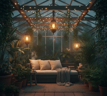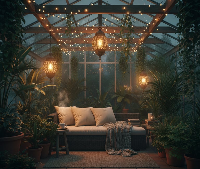 Your greenhouse shouldn't go dark when the sun sets. Installing lighting fixtures, such as string lights, lanterns, or pendant lamps, transforms the space into an evening retreat. Warm lighting highlights the textures of the leaves and makes the glass structure glow beautifully from the outside.