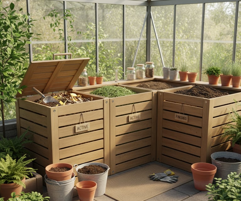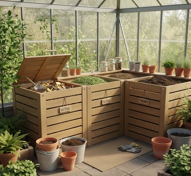 For the serious gardener, a functional cycle of nutrients is essential. A dedicated composting station, housed in neat wooden bins, allows you to recycle organic waste directly on-site. This keeps your workspace sustainable and ensures you always have nutrient-rich soil ready for your potting needs.