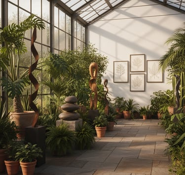 Don't let your greenhouse walls remain bare. Incorporating art and sculptures transforms a simple growing area into a curated gallery. Weather-resistant statues, stone carvings, or framed botanical prints add a layer of sophistication and personal history to the space, making it feel less like a shed and more like an extension of your home.