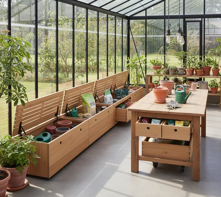 In smaller greenhouses, every inch counts. Multi-functional furniture, like a potting bench with built-in storage drawers or a rolling island, keeps tools organized and out of sight. These pieces ensure that the workspace remains uncluttered and adaptable to different tasks.