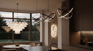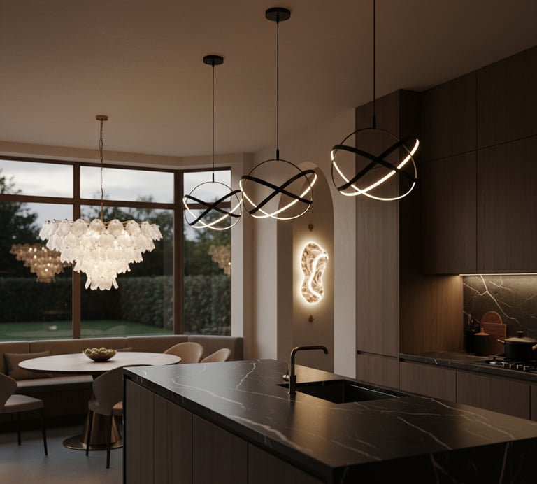 Lighting is a crucial element that sets the mood of your kitchen. Statement lighting fixtures can serve as functional art, elevating the entire space. Consider a row of industrial-style pendants over an island, a chic, elegant chandelier over a breakfast nook, or a unique sculptural fixture that acts as a conversation starter.