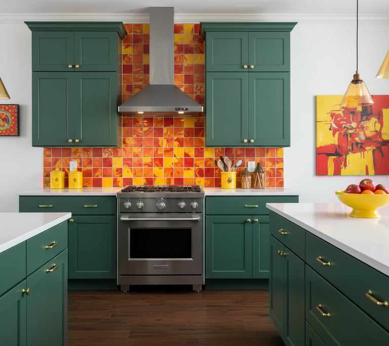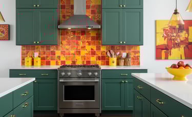 Don't be afraid to use color to transform your kitchen into a vibrant space that reflects your personality. This doesn't have to be overwhelming. You can paint cabinets a deep blue or vibrant green, add a brightly colored backsplash, or simply use fiery reds or sunny yellows in your accessories, dishware, or artwork to create an energetic atmosphere.