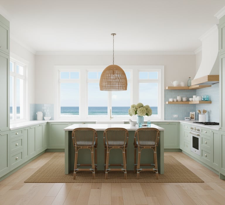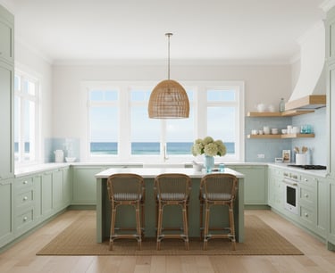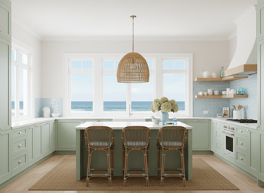 Transform your kitchen into a breezy, coastal retreat by embracing light and airy design elements. This style is built on a foundation of soft, light colors such as sandy whites, soft blues, and seafoam greens. Enhance the seaside vibe by incorporating natural textures like wicker or rattan for seating and lighting, and keep the layout open to promote a relaxed, easy-living feel.