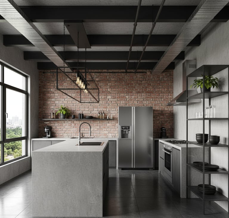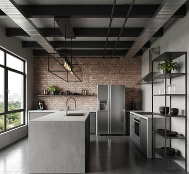 In contrast to cozier styles, the modern industrial look embraces a sleek, urban vibe. This aesthetic celebrates raw materials and structural elements. You can achieve this design by incorporating exposed brick, concrete surfaces or countertops, stainless steel appliances, and metal light fixtures. Open shelving and exposed ceiling beams or ductwork further enhance the functional and simple beauty of industrial design.