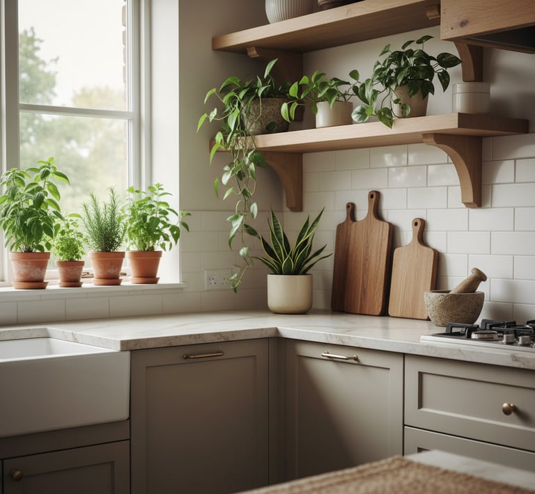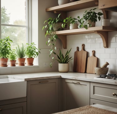 Bringing natural elements indoors can make your kitchen feel like a serene oasis. The simplest way to do this is with live plants, such as a small herb garden on the windowsill or potted plants on shelves. You can also incorporate natural materials like wood cutting boards, stone countertops, and an earthy color palette of greens, browns, and warm neutrals.